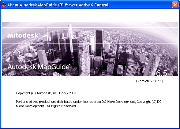 The help about window shows the Autodesk MapGuide control version number and basic copyright information.
